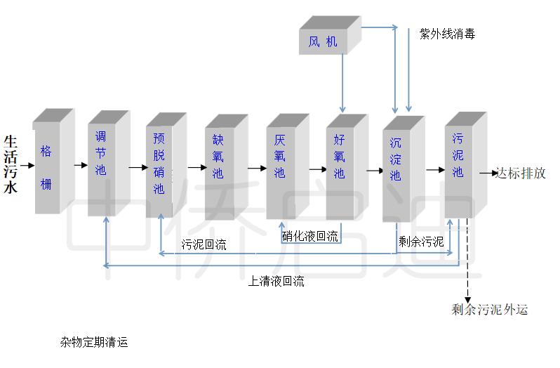 污水自流入格柵渠中,在格柵渠中安裝機(jī)械細(xì)格柵,污水先經(jīng)過(guò)細(xì)格柵除去粗大的漂浮物和懸浮物,再自流到集水池中,后經(jīng)提升泵提升至MBBR一體化設(shè)備內(nèi),污水中污染因子被微生物充分吸附、降解,在MBBR一體化設(shè)備內(nèi)污水經(jīng)過(guò)預(yù)脫硝區(qū)﹑厭氧區(qū)﹑缺氧區(qū)﹑好氧區(qū)﹑沉淀區(qū),沉淀區(qū)安裝污泥回流氣提裝置,好氧區(qū)安裝混合液回流裝置,污泥回流至預(yù)脫硝區(qū),混合液回流至缺氧區(qū),好氧區(qū)出水流入至沉淀區(qū)固液分離,出水經(jīng)紫外線消毒后排入附近的水體中。